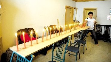 这次照葫芦画瓢,他把木板加长到3米,摆了30根蜡烛。