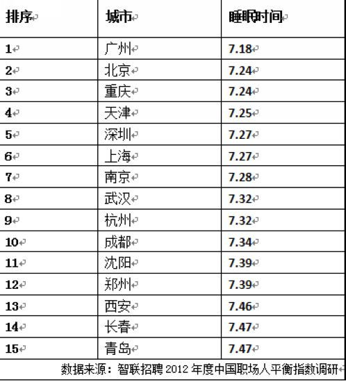 大河网讯(记者 王书栋 实习生 李科普)智联招聘联合北京大学社会调查研究中心发布“2012年度中国职场人平衡指数调研报告”显示,中国职场人平均日工作时间为8.66小时,平均睡眠时间为7.33小时。郑州职场人日平均工作时间为8.82小时,居全国第五位,日平均睡眠时间为7.39小时。