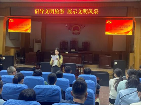 活动中,政治部副主任徐婷婷宣读了《文明旅游倡议书》,提倡全院干警自觉维护《中国公民国内旅游文明行为公约》和《中国公民出国(境)旅游文明行为指南》。在双节旅游活动中,自觉维护环境卫生,遵守公共秩序,保护生态环境,爱护文物古迹,爱惜公共设施,尊重当地风俗习惯,不随地吐痰,不乱扔垃圾,不践踏草坪,不在禁烟场所吸烟,不在公众场合喧哗,让文明旅游成为一种新风尚。